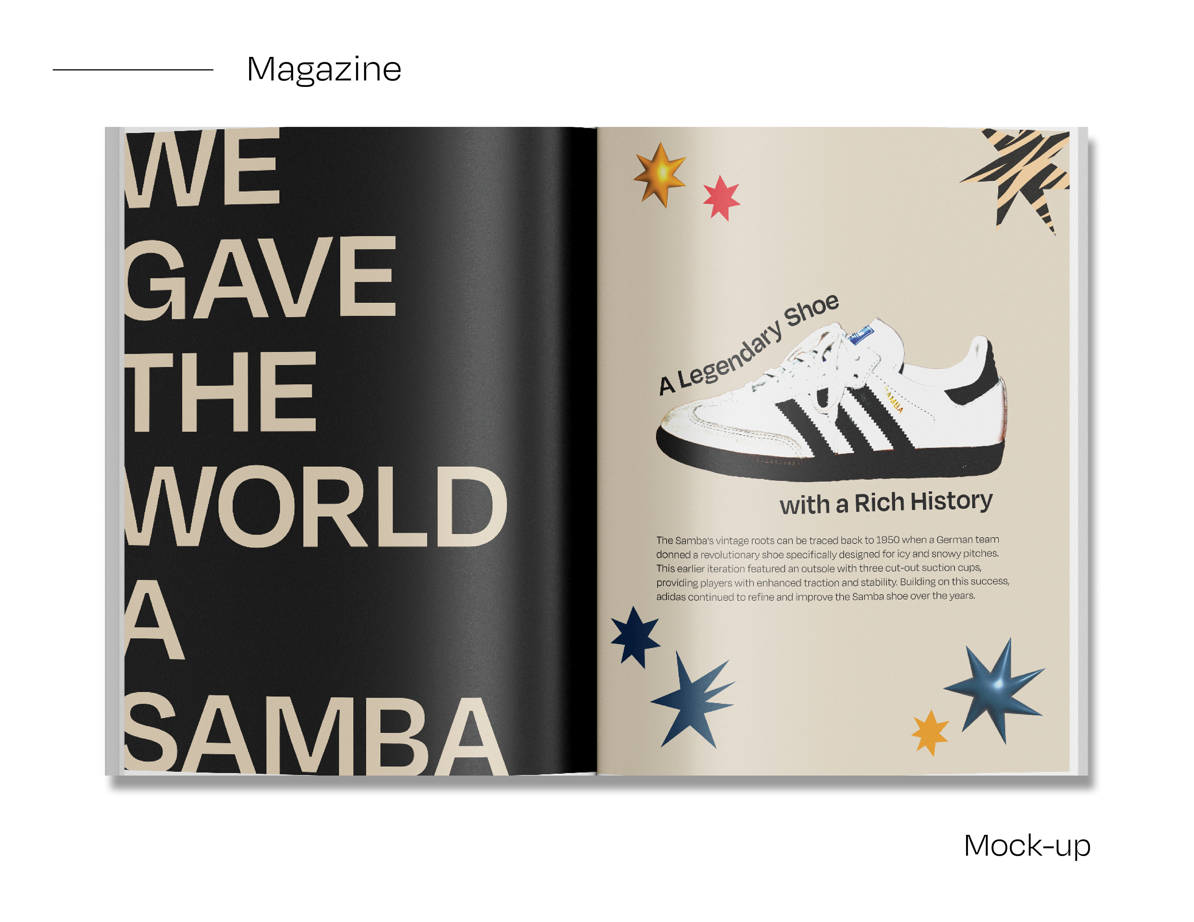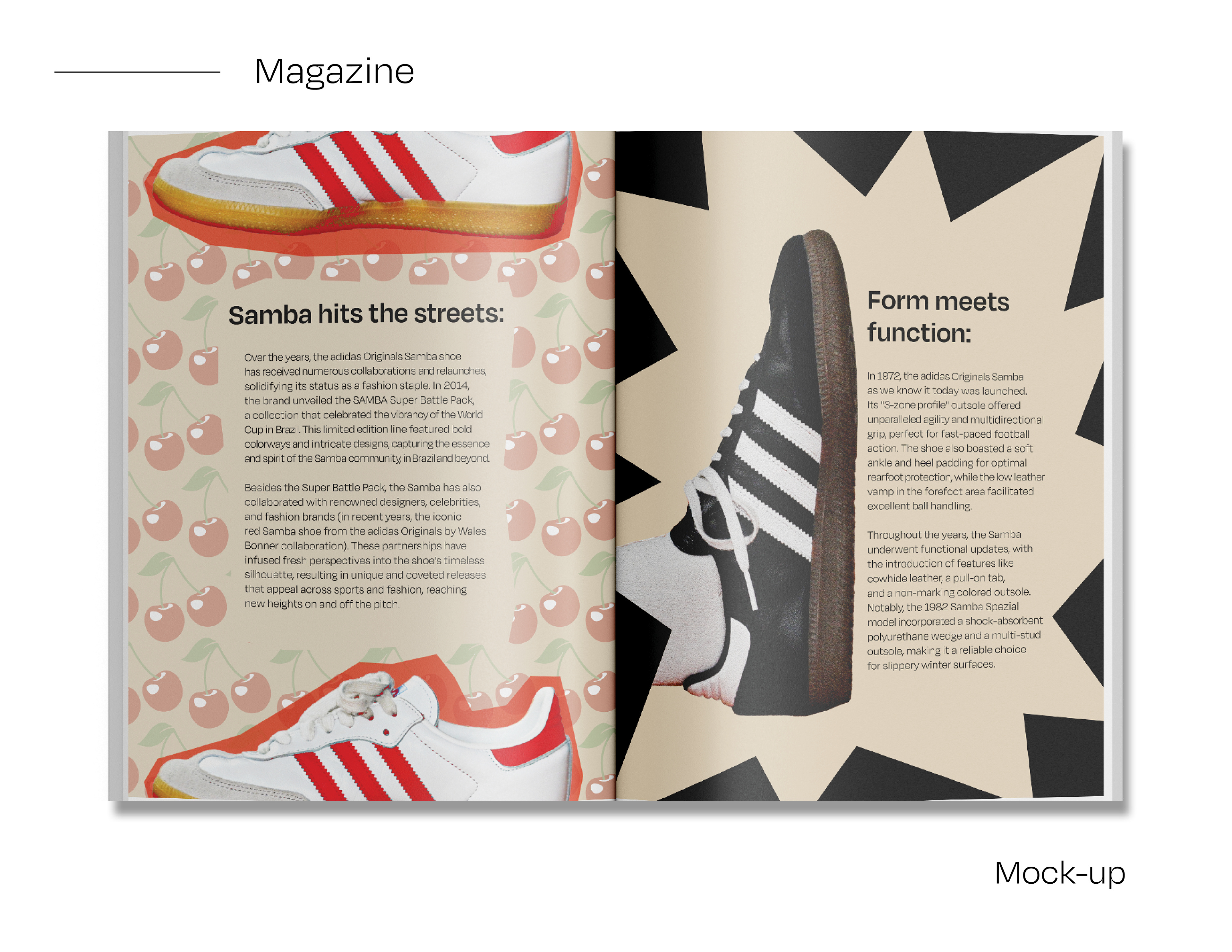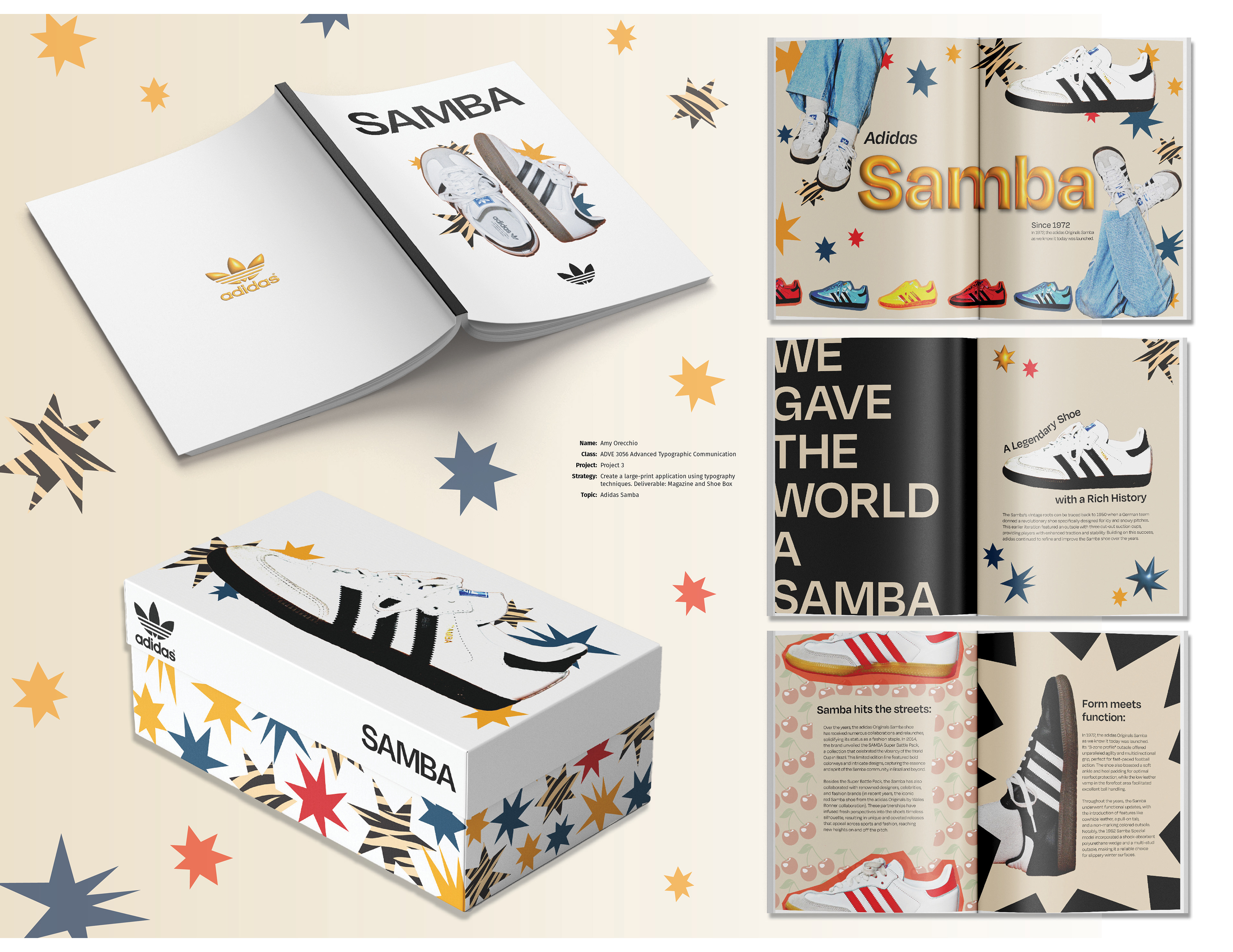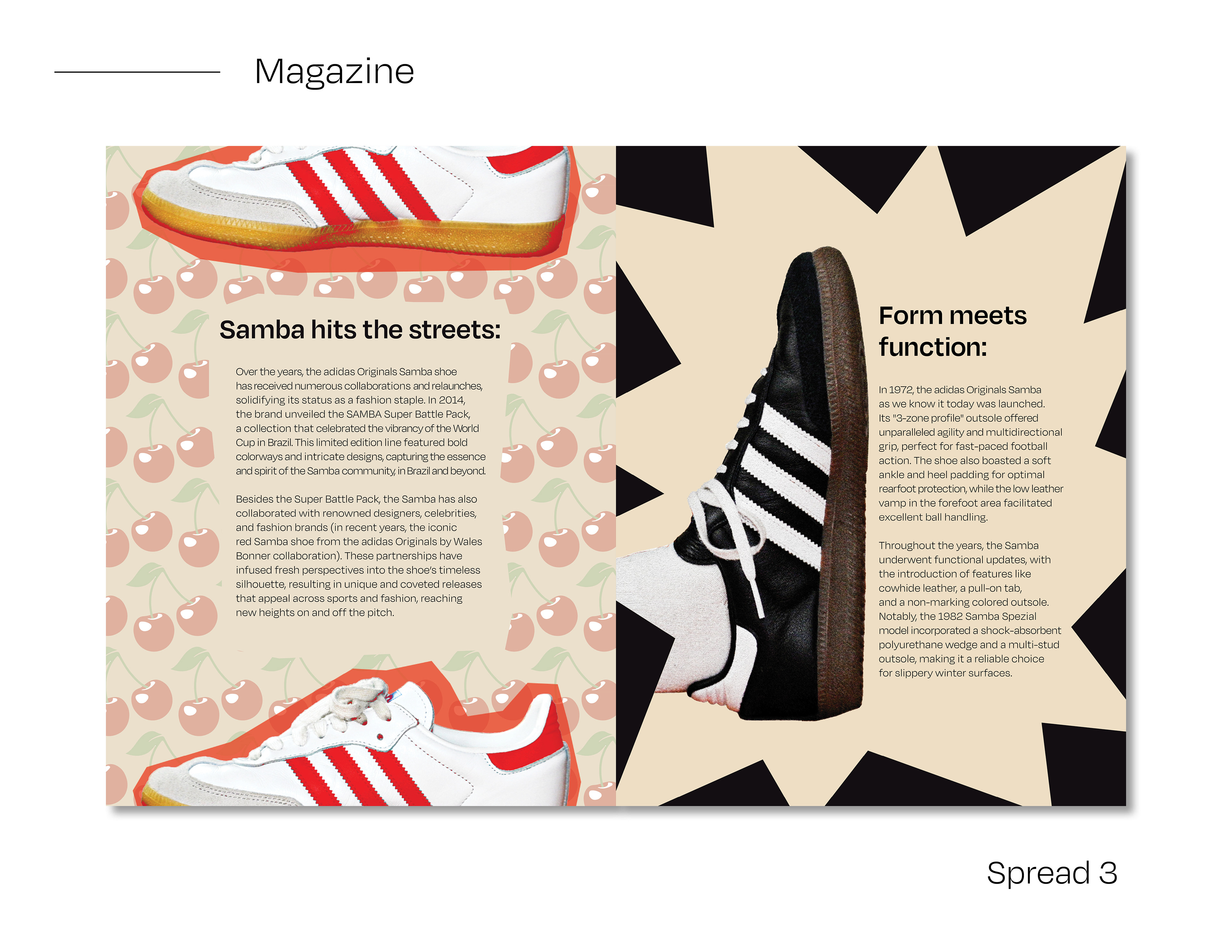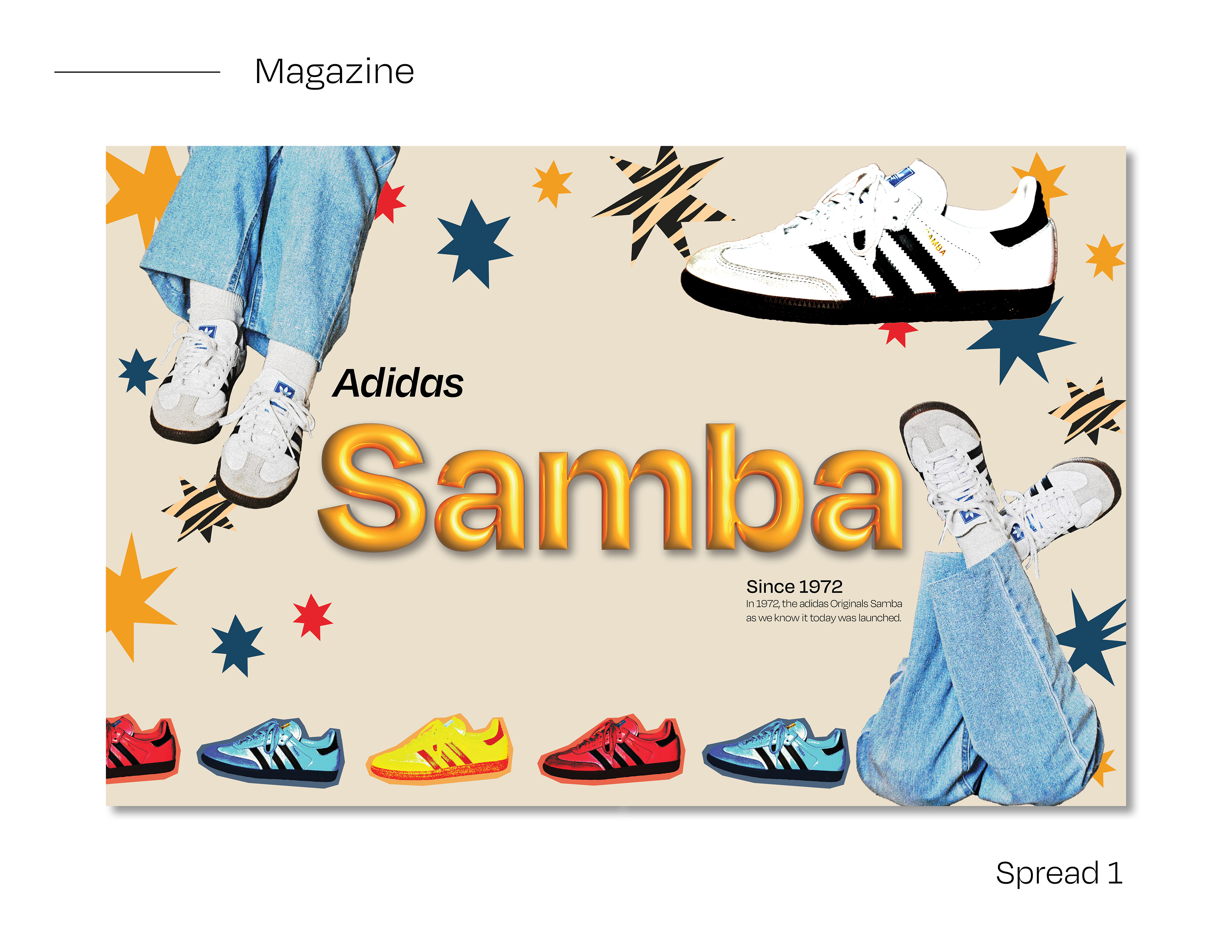 I created an editorial booklet based on the article “We Gave the World a Samba: A Legendary Shoe With a Rich History.” The booklet design emphasizes the shoes’ aesthetics, style, and branding. I also designed a complementary shoe box to support the overall visual concept.